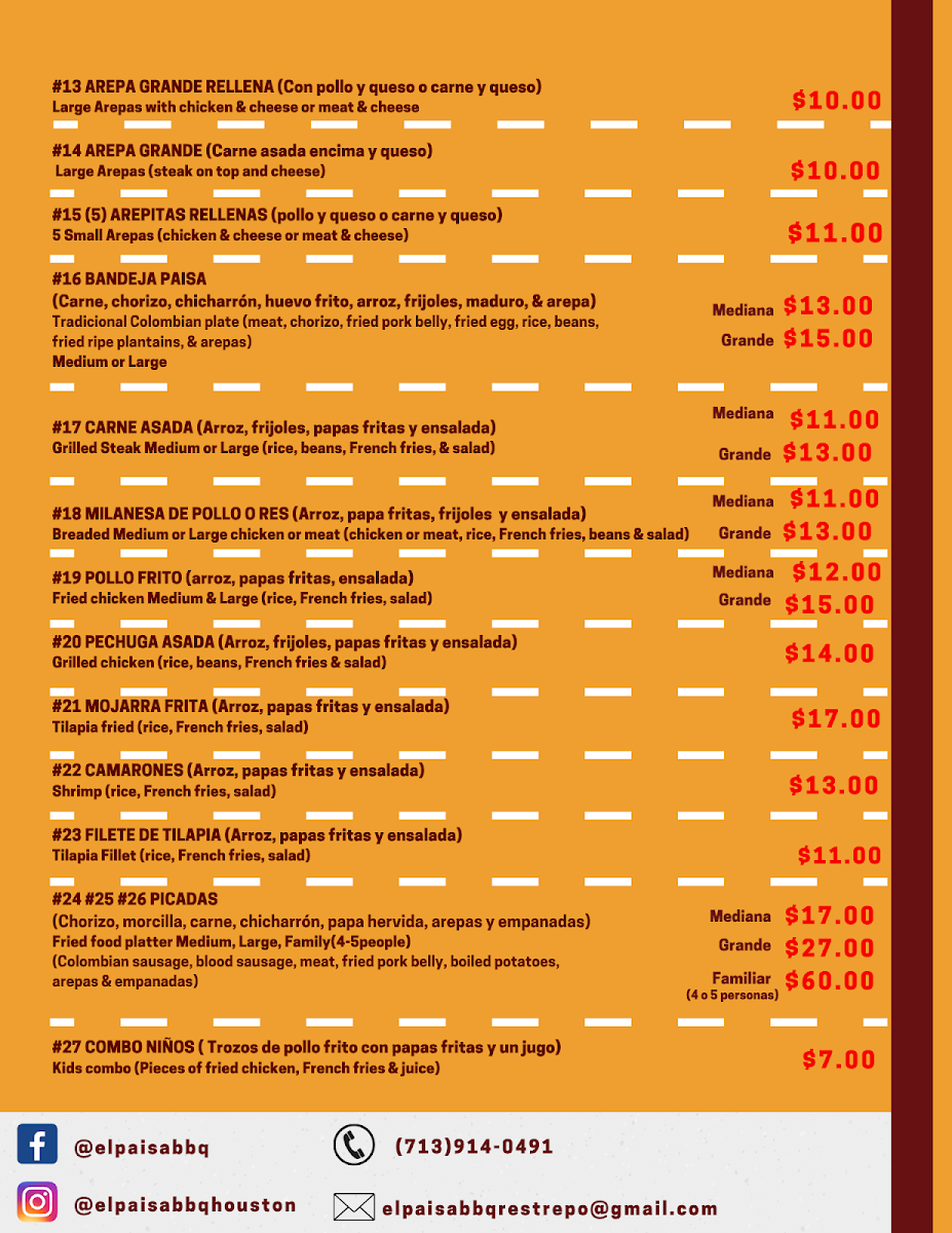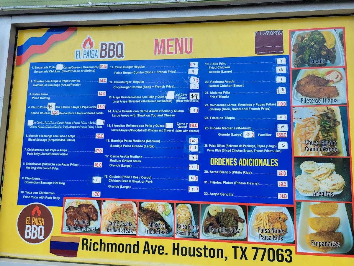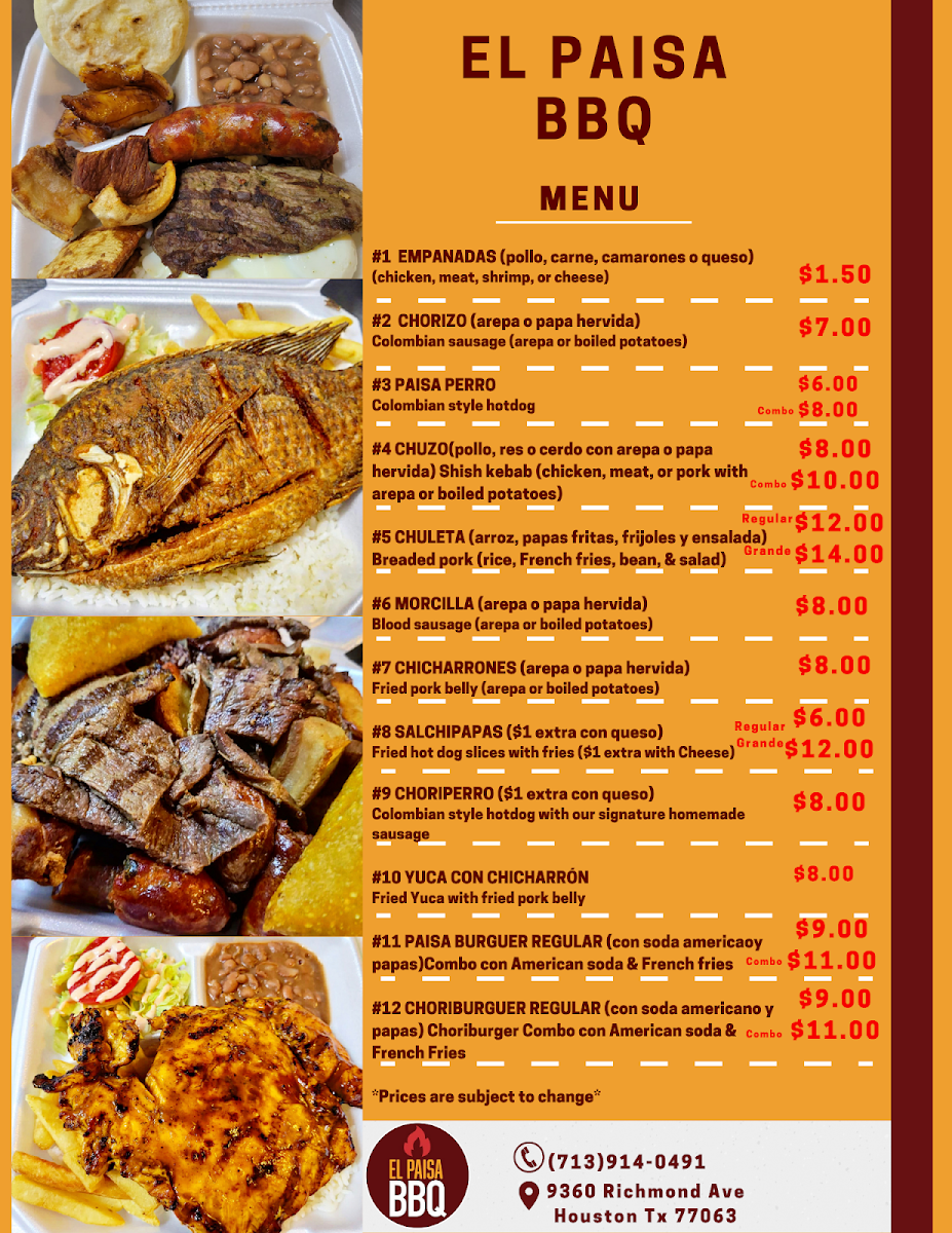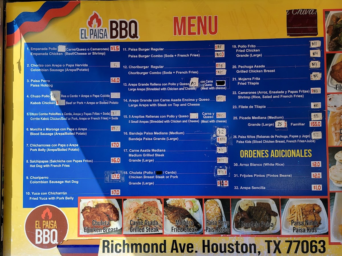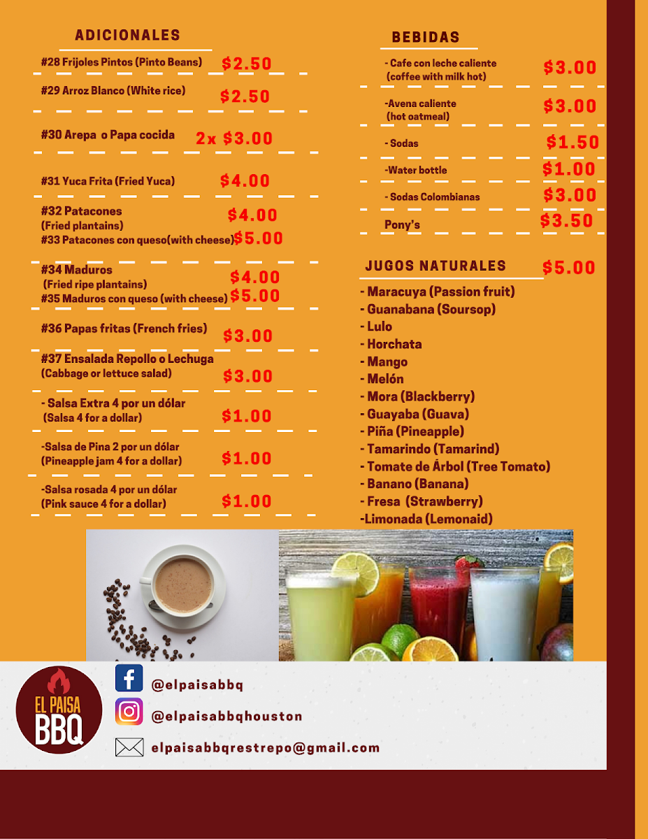 The menu features a variety of traditional Colombian and barbecue dishes, organized to offer a range of options for different meal preferences. Food selections include hearty main plates such as Bandeja Paisa in different sizes, Mojarra Frita, Carne Asada Plate, and traditional items like Morcilla or Moronga served with potato or arepa. Additionally, popular snack items like Beef Empanadas, Chorizo with Arepa, and various burger options are available.