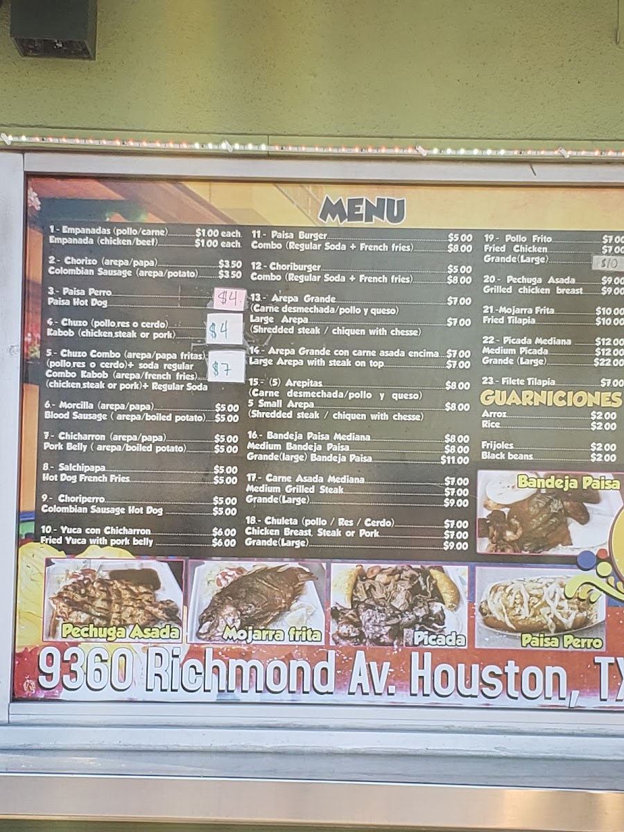 Side items include common accompaniments such as rice, beans, arepa, and boiled potatoes, which complement the main dishes to complete the meal. The menu is suited for quick ordering and takeout, typically through a small service window, catering well to customers seeking casual, on-the-go meals. Pricing for individual items is generally moderate, supporting both light bites and full meals.
